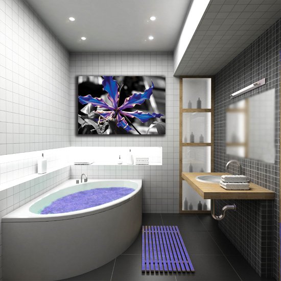 Jeśli zdecydujemy się ozdobić taką łazienkę obrazem nad wanną, dobrze, żeby przedstawiał on jakiś subtelny i świetlisty motyw. Najlepiej będą prezentowały się tu wszelkie wzory, związane z wodą, soczystą roślinnością lub klimatem Spa. Obrazy emanujące świeżością będą sprzyjać relaksowi i dadzą poczucie nieskazitelnej czystości, panującej w łazience. Ciekawie będzie wyglądało tak zaaranżowane pomieszczenie, aby umieszczony nad wanną obraz odbijał się w lustrze nad umywalką, albo w lustrzanych frontach szafek. Taki efekt wielowymiarowości da wizualne złudzenie poszerzenia naszej łazienki.